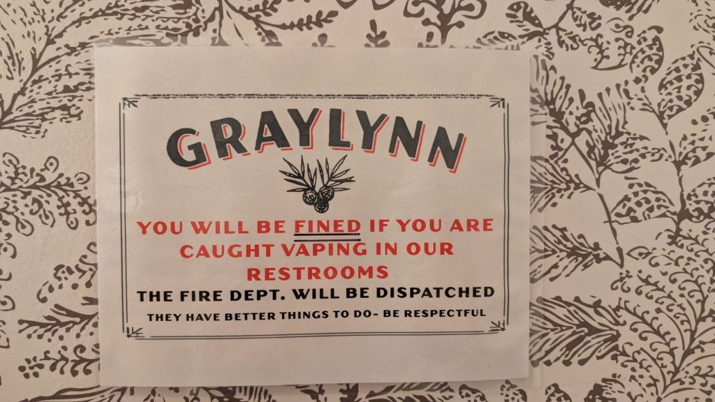 He charged me with finding a place for cocktails and apps ahead of the game, and I feel I delivered. I chose Graylynn Gin Bar. It was delightful! And our waitperson, Kat, liked my hair. I recommended dry shampoo to her (at her request), but her hair was gorgeous and perfect. She has nothing to worry about. I had a schmancy grilled cheese with plums and green apple in it. Never had anything like it, and I loved it. Bob had. He had. It was something he was delighted with, but I cannot remember because I was busy being besties with Kat and my food.