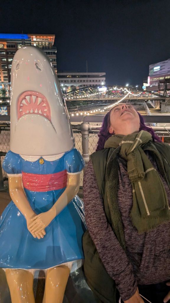 Post game, we cruised back to the car, and snagged a photo of me with Shark Girl, which I insist on every time we walk by her. Then the long drive home. I cranked the stereo in the car and yelled along to Hozier and Mars and more.
