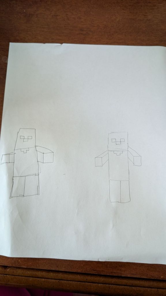 Yesterday after work, he sat me down and handed me a pencil. He put down a piece of paper between us, and said, “ok mom, now I’m going to teach you to draw something. I watched a ‘learn to draw’ on YouTube, so I know what to do.” And he walked me through drawing a Minecraft zombie. After each step he would give me immediate feedback (I made the mouth too wide and had to start over, but I did an excellent job on the arms), and then he would draw the next step, while narrating what he was doing. He was very pleased with the outcome.