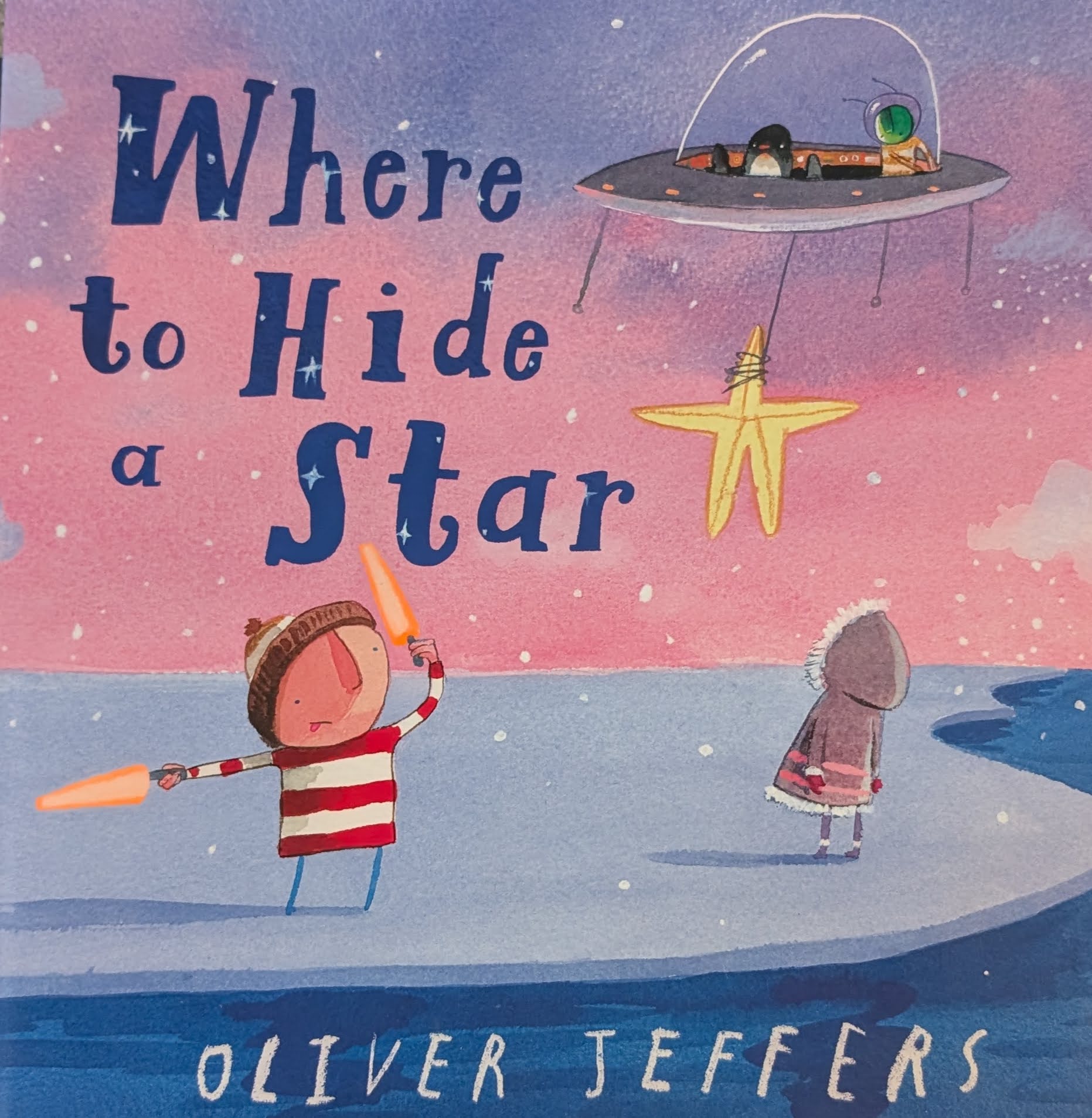 And luckily, this next book implicitly answers the question of whether the boy and martian keep in touch! Where to Hide a Star brings back the boy, the penguin, the star, and the martian, while introducing a new friend. I love it because it brings back all the characters I’ve already fallen in love with, and shows that there is always space for more friendship. I’m charmed by the solution to the problem of sharing that crops up, and how well the friends support one another.