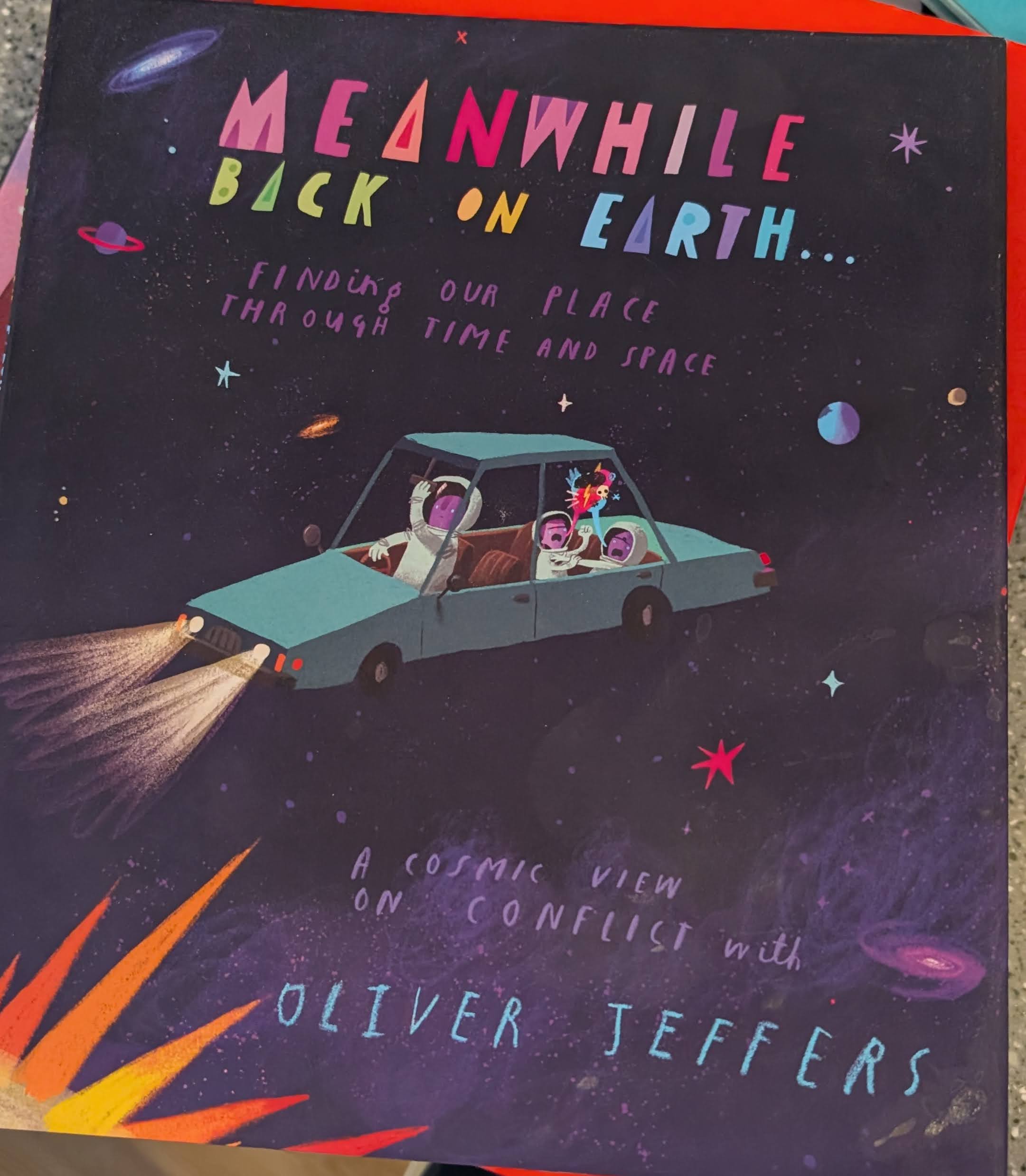Meanwhile Back on Earth is lovely for gaining perspective. Why fight each other, little petty fights, and massive conflicts, when we are so, so, so insignificant (in a good way). I related to the dad in this story (we always call the adult man in these books “Oliver Jeffers” and I don’t know if that’s his intent, but there we are), because he’s got kids bickering in the backseat, and just trying to talk them through it. I mean, in real life if I’m driving I go berserk in a deeply unattractive way, but if I’m not driving, I do try to reason.