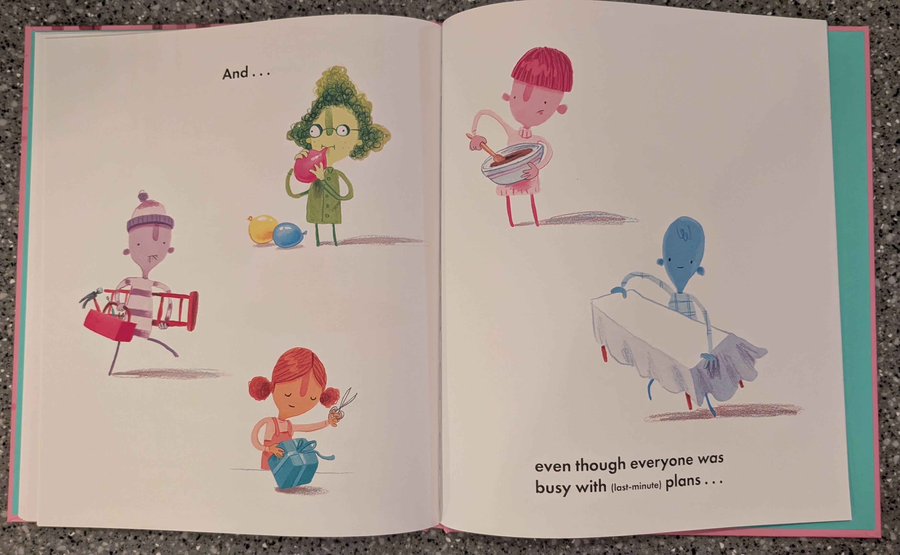 I’m Very Busy is a cute read. And it looks like Grant and I had different takeaways from it. My read was that the friends made time for their friend when they realized they forgot, and Grant’s is that the friends were busy with party plans from the start. He’s an optimist! From here on out there are more interior pictures because Grant got involved.
